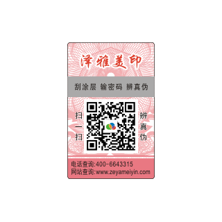 常见的一种防伪标是【刮开式数码防伪标】这种防伪标是在标签纸上喷印防伪数码,然后再在数码上喷涂一层特殊的油墨而制成。这种防伪标识在使用时可通过刮掉覆盖的油墨后,查询防伪数码来到达产品的防伪意图。